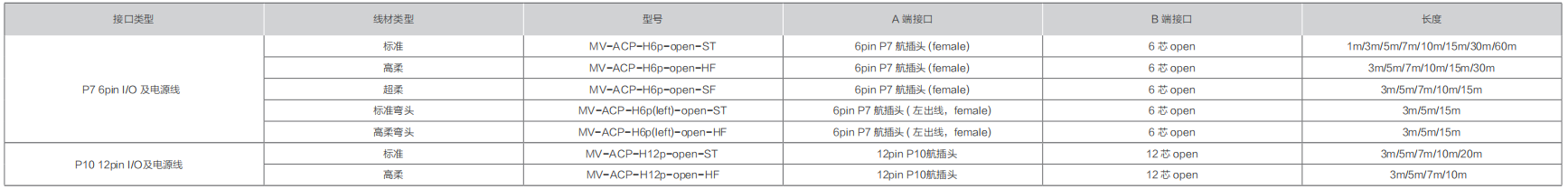 線纜接口齊全,電(diàn)源線通(tōng)蓋P7 6pin/P10 12pin 及M12等各類航空(kōng)頭連接線,數(shù)據線包含GigE、10GigE、USB3.0.Camera Link、CoaxPress等多(duō)種接口,滿足不同類型工業相機接入使用