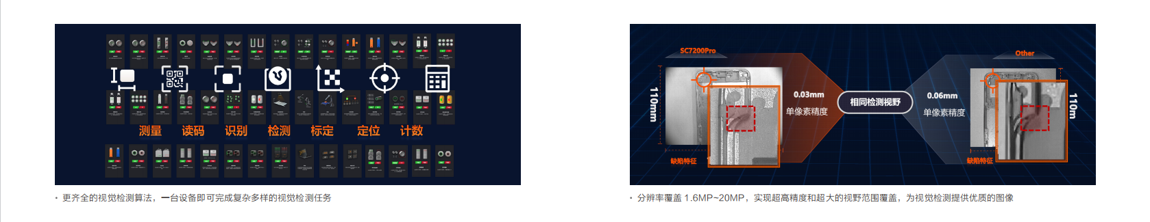 SC5000 智能相機采用全新軟件框架,搭配更加豐富的視(shì)覺檢測算(suàn)法,檢測性能更強;配置簡單,操作(zuò)便捷,在定位測量、機械手協同作(zuò)業、快速缺陷檢測場(chǎng)景下均有(yǒu)不俗的應用,可(kě)全面覆蓋常規視(shì)覺檢測場(chǎng)景。