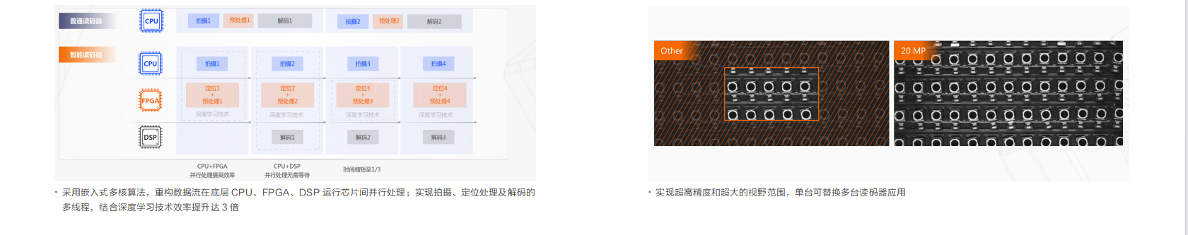 一款全功能型固定式工業讀碼器(qì),基于高(gāo)性能多(duō)核深度學習核心處理(lǐ)器(qì),帶來(lái)強悍的讀碼性能和(hé)超大(dà)視(shì)野範圍覆蓋。滿足苛刻的環境要求,讀碼率、讀碼效率優異,可(kě)廣泛應用于 PCB、汽車(chē)、制(zhì)造業、內(nèi)物流、食藥品等行(xíng)業。